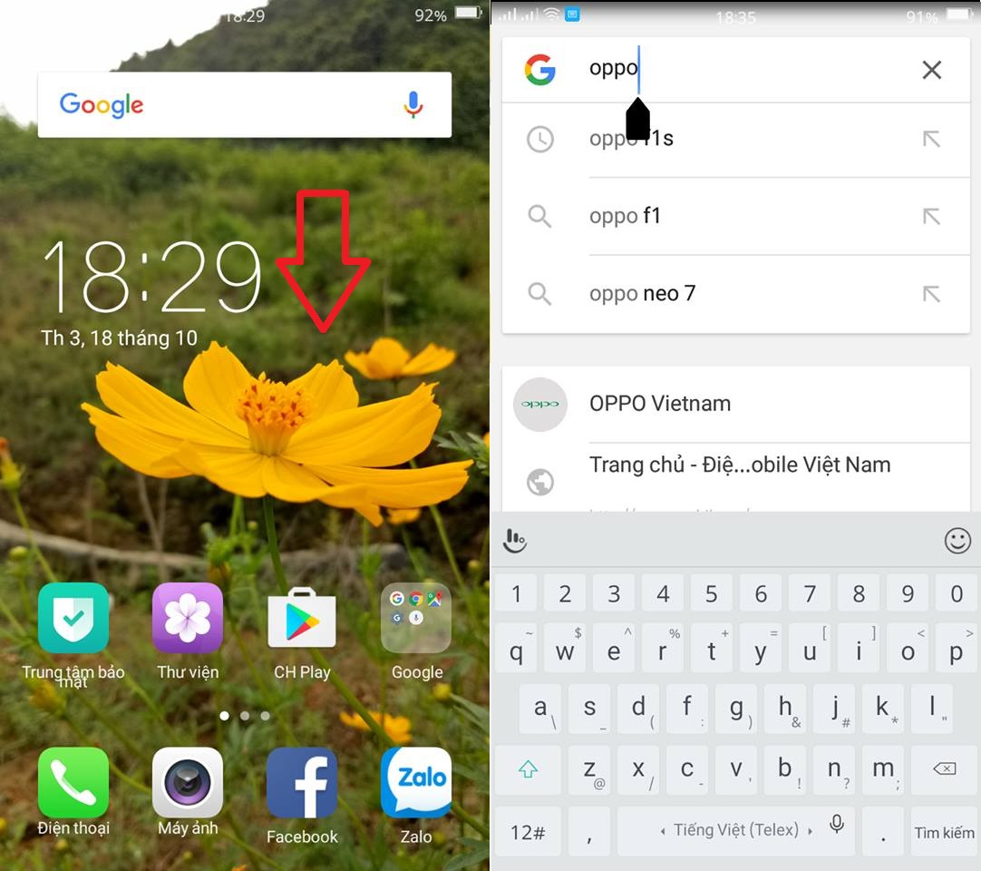 Tuy nhiên, trên OPPO F1s nếu muốn tìm kiếm từ khoá gì đó, người dùng chỉ cần vuốt khoảng trống từ trên xuống và gõ từ đó vào thanh để tìm kiếm.