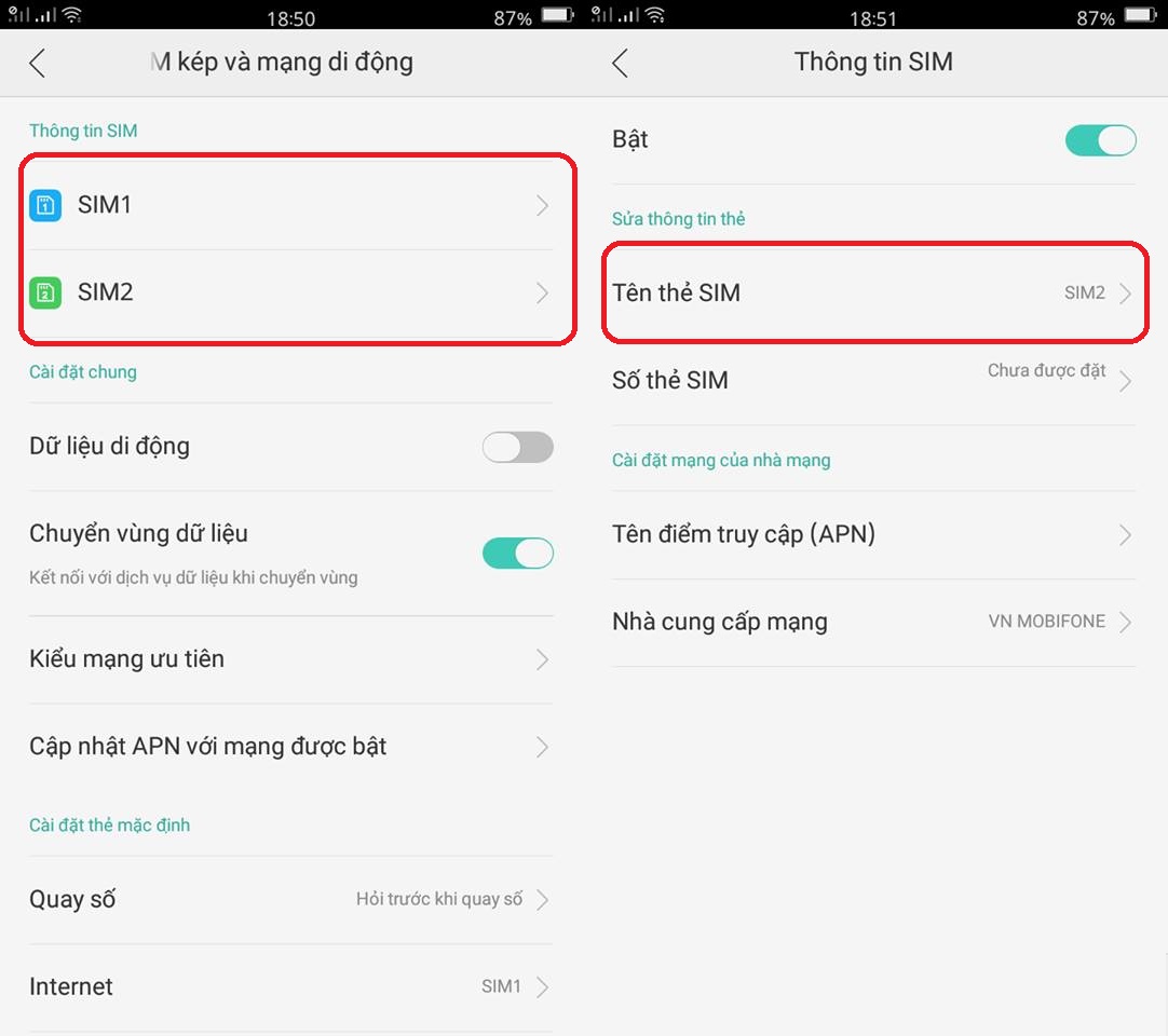 Bạn có thể tuỳ chỉnh tên của thẻ sim để dễ dàng phân biệt khi dùng cùng lúc 2 sim trên thiết bị. Người dùng chỉ cần vào Cài đặt > Mạng di động > Chọn Sim. Cuối cùng, bạn có thể đổi tên ở mục Tên thẻ Sim.