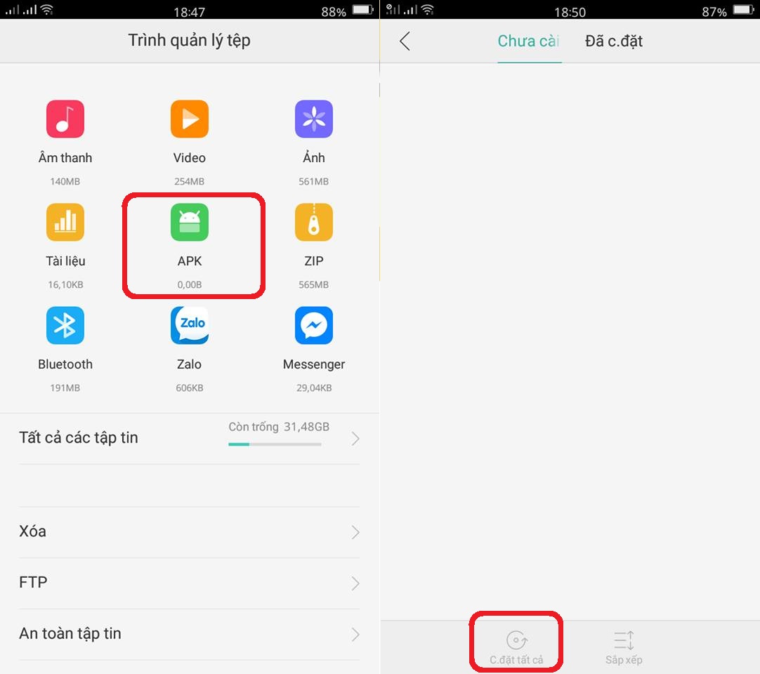 Trên OPPO F1s, bạn có thể cài đặt đồng loạt các file APK có sẵn trong máy chỉ với một lần nhấn. Để thực hện, bạn vào Quản lí file > APK > Cài đặt tất cả.