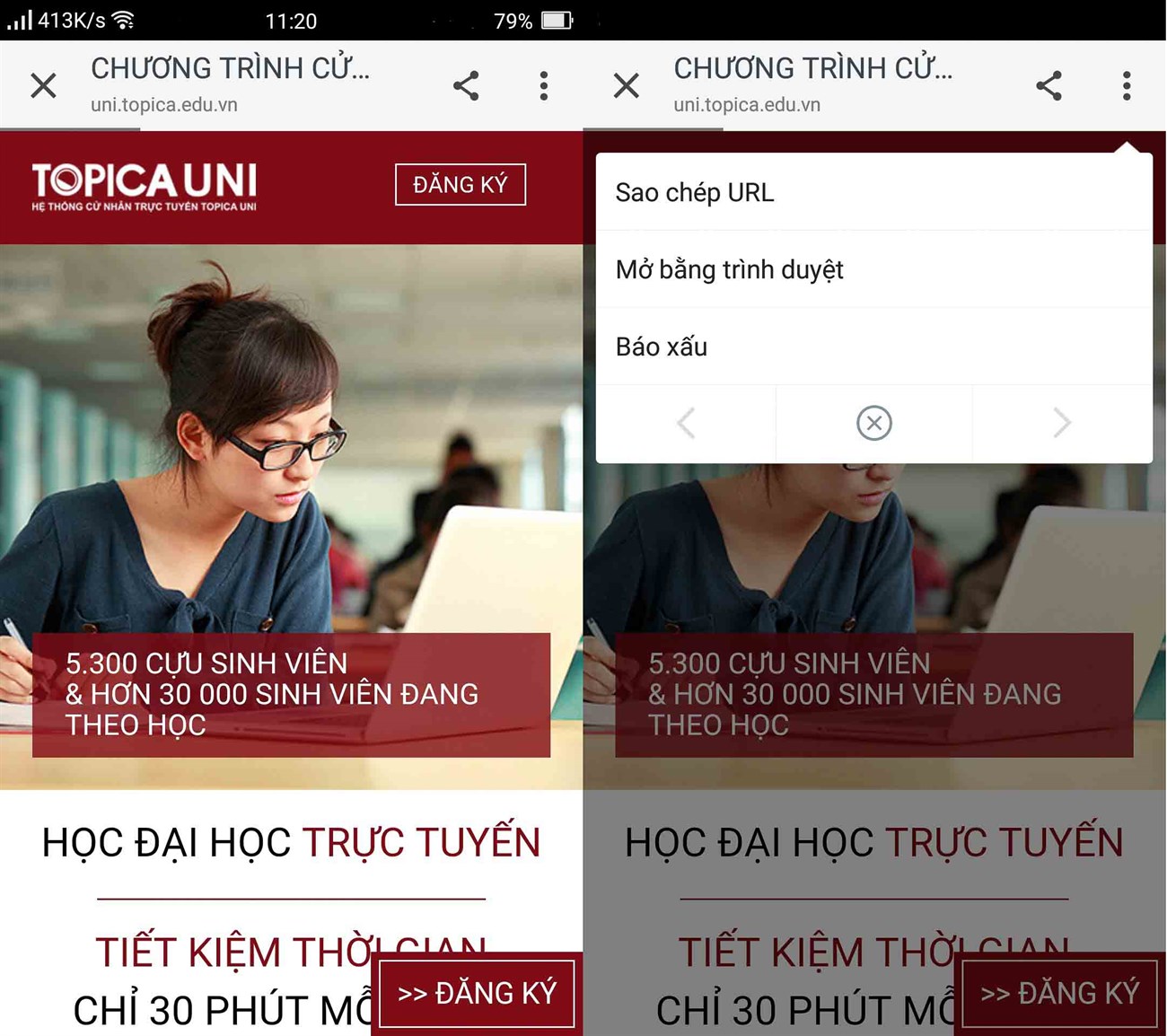 Tương tự Facebook, Zalo cũng được tích hợp trình duyệt riêng nhưng người dùng vẫn có thể mở đường link bằng ứng dụng khác khi nhấn vào dấu 3 chấm phía trên góc phải màn hình và chọn mục "Mở bằng trình duyệt".