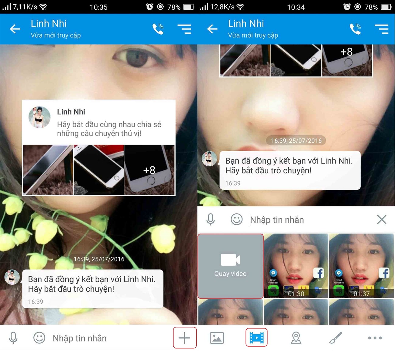 Nếu bạn muốn chia sẻ những đoạn video cho bạn bè thông qua Zalo thì hãy nhấn vào icon dấu "+". Sau đó, chọn biểu tượng video phía dưới màn hình và tìm để video muốn chia sẻ. Người dùng có thể quay mới hoặc chọn những clip cũ.