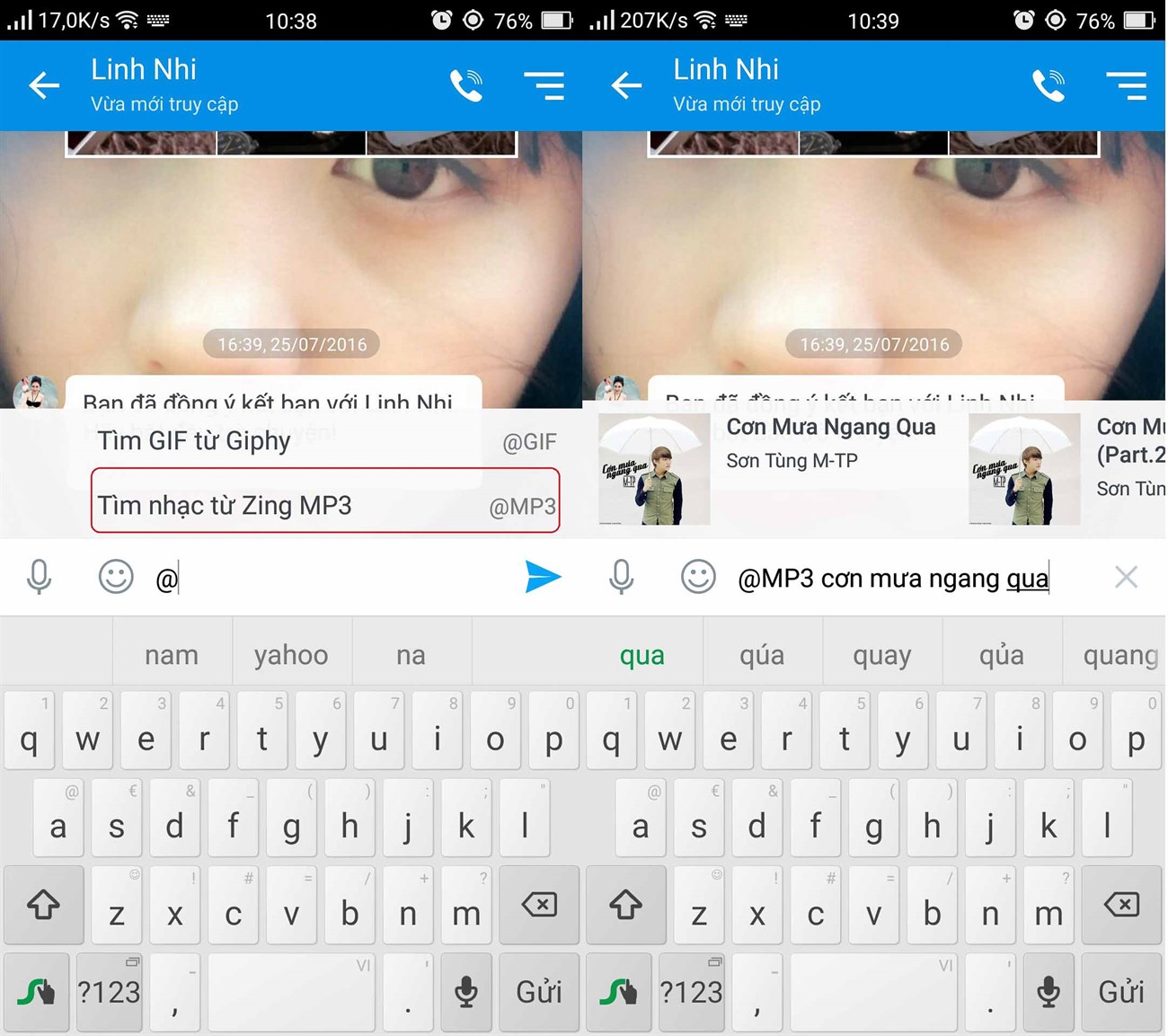 Đây là một trong hai tính năng vừa được cập nhật. Chúng ta chỉ cần gõ @ trước câu hội thoại sau đó có thể lựa chọn chức năng gửi ảnh GIF hoặc nghe nhạc MP3. Sau đó, bạn hãy gõ cụm từ liên quan để bức ảnh đó và lựa chọn những gợi ý từ hệ thống.