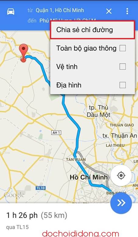 Sau khi nâng cấp xong các bạn hãy tìm tuyến đường cần chia sẻ vd mình đi từ quận 1 TP HCM đến phú mỹ hưng, rồi sau đó chọn vào 3 dấu chấm phía trên và chọn phần chia sẻ chỉ đường