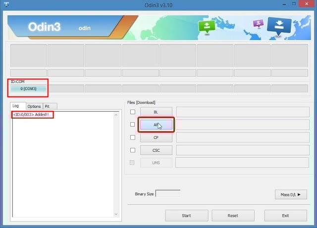 • Sau khi Odin xác nhận điện thoại bạn đã được kết nối các bạn hãy click vào nút "AP" và chọn tập tin twrp-2.8.7.0-a5ultexx-11112015.tar.md5