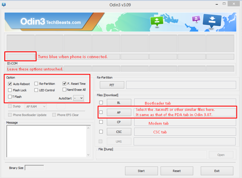 Bước 4: Ngay sau khi Odin đã phát hiện điện thoại của bạn ở chế độ download mode, "ID: COM" trên góc trên cùng bên phải sẽ chuyển sang màu xanh.