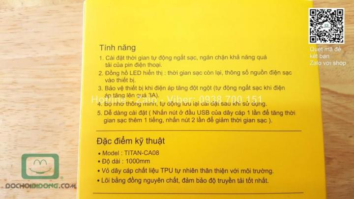 Cáp thông minh MicroUSB Titan hiển thị led kĩ thuật số với thiết kế độc đáo có đồng hồ led hiển thị thời gian sạc còn lại, thông số nguồn điện sạc vào thiết bị, có thể cài đặt thời gian tự động ngắt sạc, ngăn chăn khả năng quá tải của pin điện thoại. Cáp sẽ bảo vệ cho thiết bị khi điện áp tăng đột ngột, tự động ngắt sạc khi điện áp tăng lên quá 3A , có bộ nhớ thông minh tự động lưu lại cài đặt sau khi sử dụng.