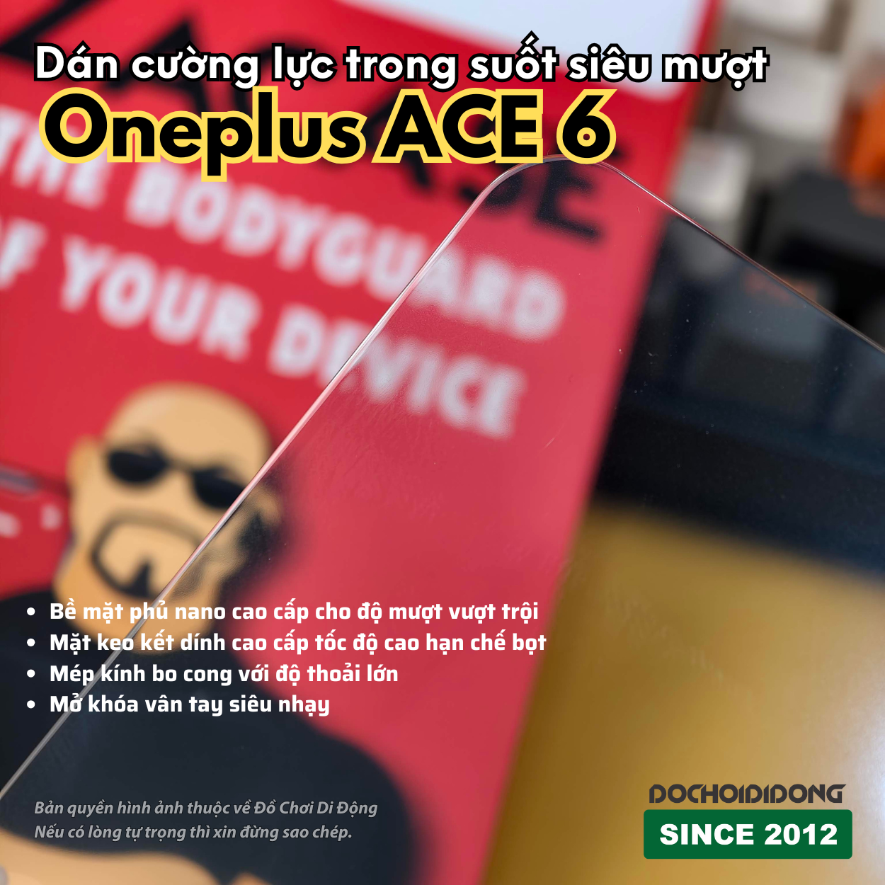 ► OnePlus Ace 6 sử dụng vân tay dưới màn hình. Loại kính này sử dụng lớp keo kết dính cao cấp và độ dày tối ưu, đảm bảo tốc độ nhận diện vân tay nhanh và chính xác như khi chưa dán.