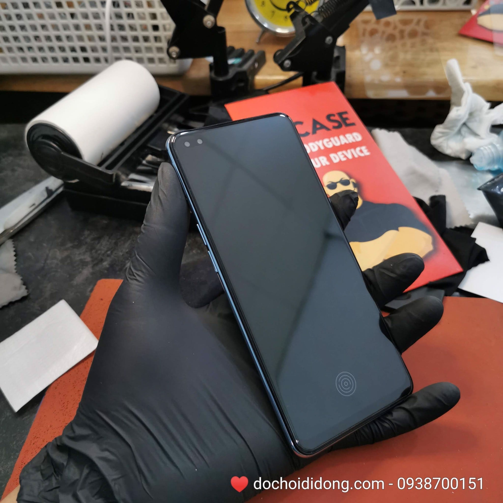 Nói tóm tắt, đây là kiểu dán cường lực sử dụng keo lỏng rời, đổ keo lên màn hình điện thoại, rồi đặt kính cường lực chuyên dụng lên, keo sẽ lan đều khắp màn hình. Cuối cùng, chúng ta dùng đèn chiếu tia UV để chiếu qua giúp keo khô lại, kết dính kính và màn hình lại với nhau.