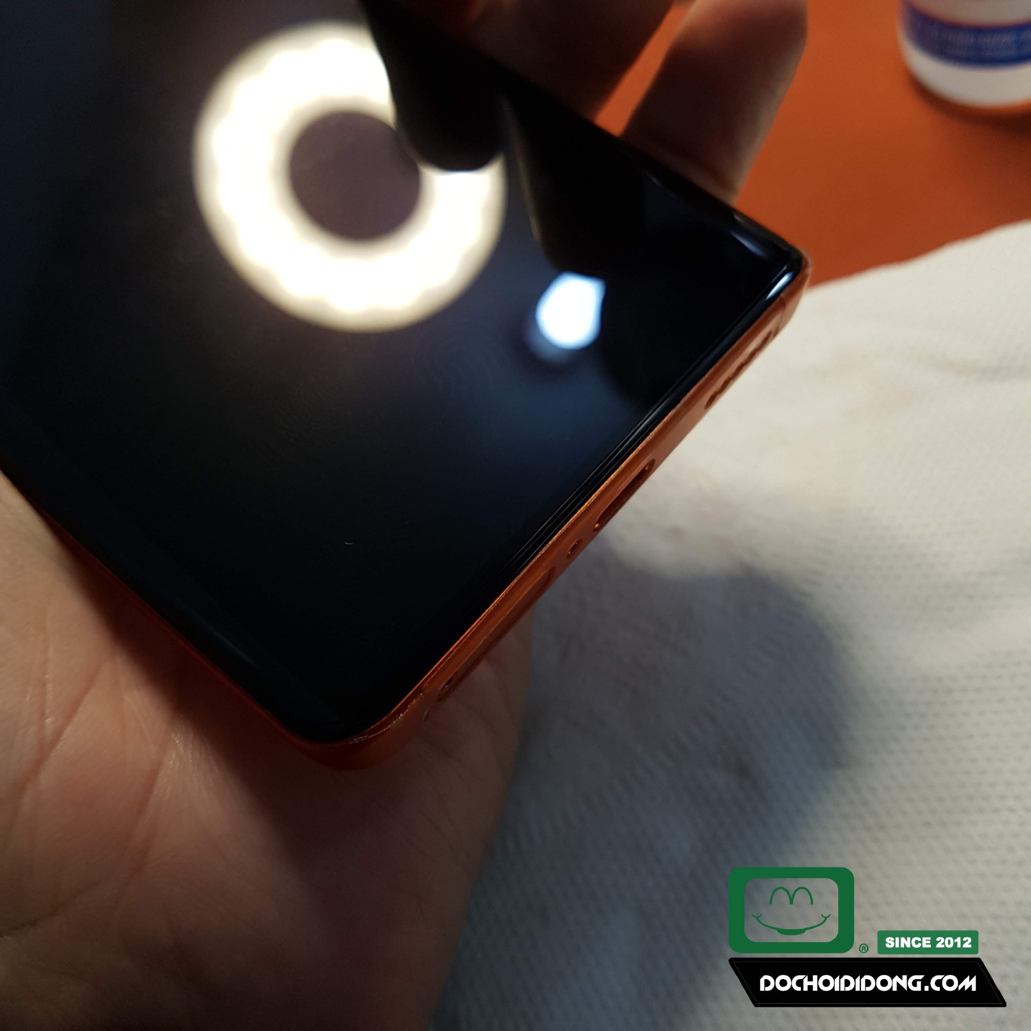 Nói tóm tắt, đây là kiểu dán cường lực sử dụng keo lỏng rời, đổ keo lên màn hình điện thoại, rồi đặt kính cường lực chuyên dụng lên, keo sẽ lan đều khắp màn hình. Cuối cùng, chúng ta dùng đèn chiếu tia UV để chiếu qua giúp keo khô lại, kết dính kính và màn hình lại với nhau.