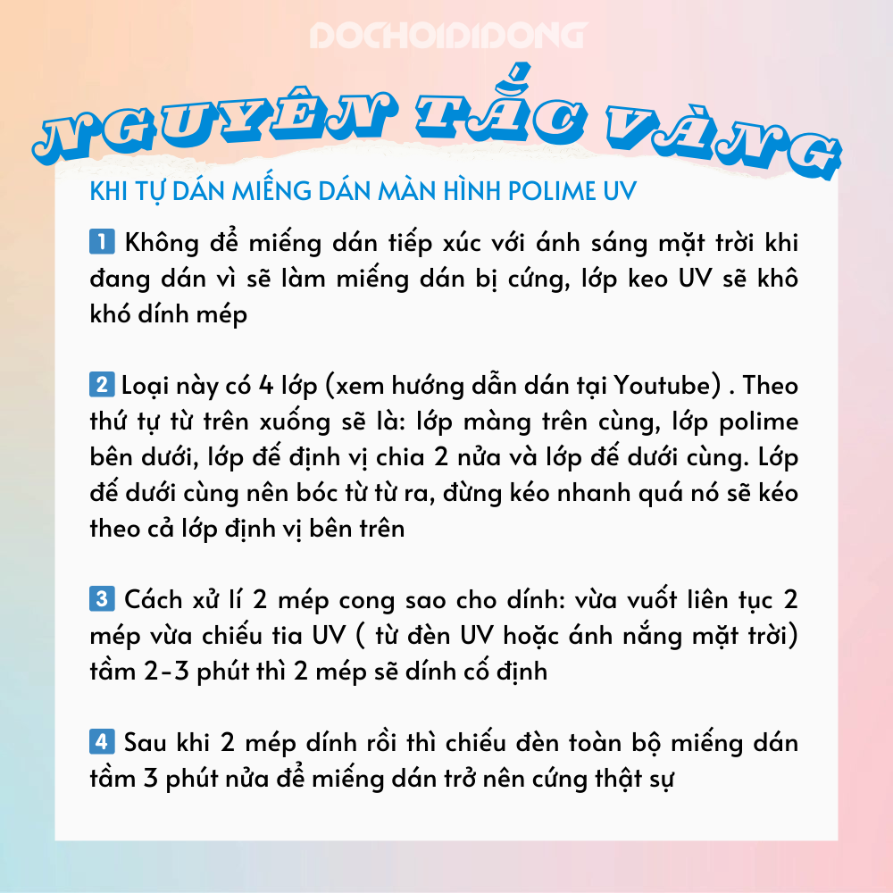 1️⃣Không để miếng dán tiếp xúc với ánh sáng mặt trời khi đang dán. Vì như vậy sẽ làm miếng dán bị cứng đi, lớp keo uv sẽ khô lại nên sẽ khó dính mép.