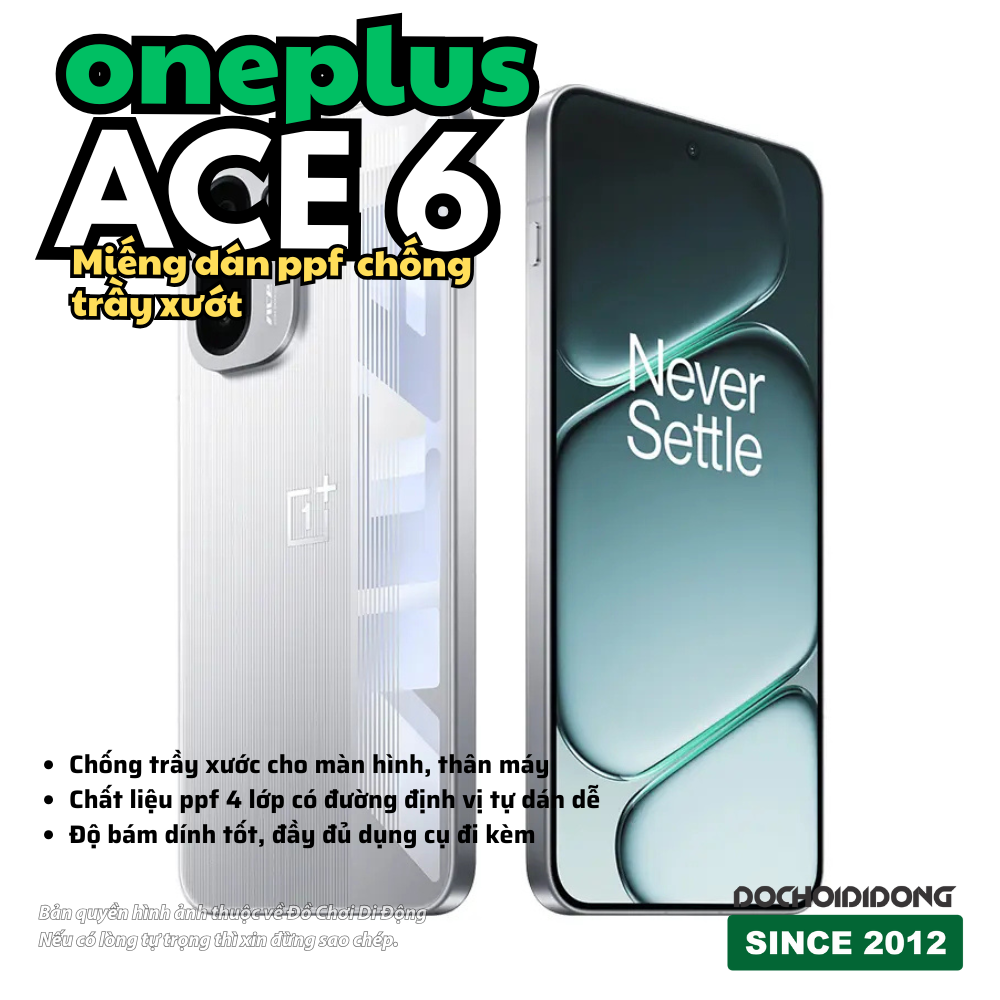 OnePlus Ace 6 sở hữu thiết kế mặt lưng độc đáo và cụm camera ấn tượng. Để giữ trọn vẹn vẻ đẹp "Never Settle" này mà không cần dùng ốp lưng dày cộm, miếng dán PPF (Paint Protection Film) từ Đồ Chơi Di Động là sự lựa chọn tối ưu nhất.
