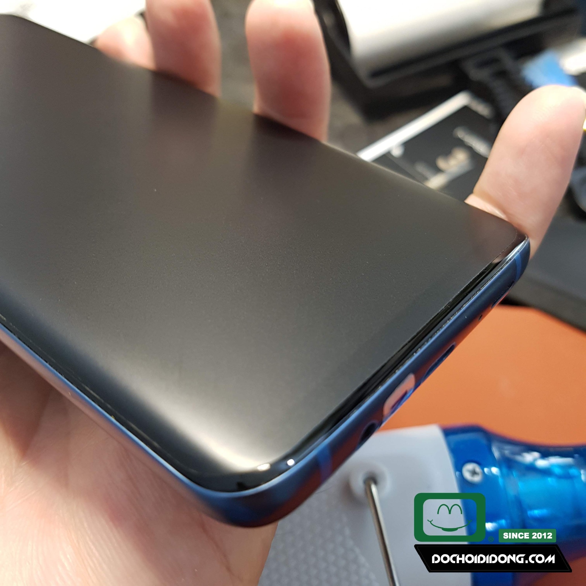 2. Gỡ bỏ đường định vị chính giữa miếng dán, cầm 2 đầu còn lại của miếng dán canh vị trí sao cho như ý. Dùng ngón tay đè nhẹ lên đường định vị cho miếng dán được cố định, sau đó dùng 1 miếng bìa cứng như thẻ ATM gạt 1 nửa miếng dán phía trên, tương tự cho phần dưới. Riêng những thiết bị nhỏ như đồng hồ thì bạn chịu khó canh tay, vì nó quá nhỏ nên ko cần đường định vị.