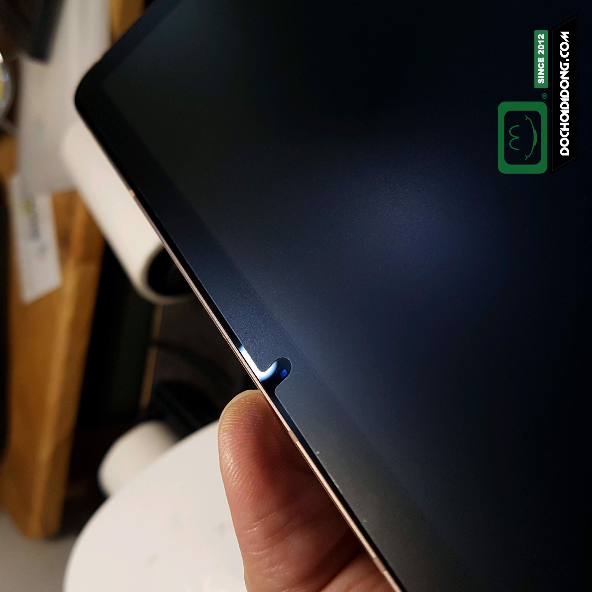 2. Gỡ bỏ đường định vị chính giữa miếng dán, cầm 2 đầu còn lại của miếng dán canh vị trí sao cho như ý. Dùng ngón tay đè nhẹ lên đường định vị cho miếng dán được cố định, sau đó dùng 1 miếng bìa cứng như thẻ ATM gạt 1 nửa miếng dán phía trên, tương tự cho phần dưới. Riêng những thiết bị nhỏ như đồng hồ thì bạn chịu khó canh tay, vì nó quá nhỏ nên ko cần đường định vị.