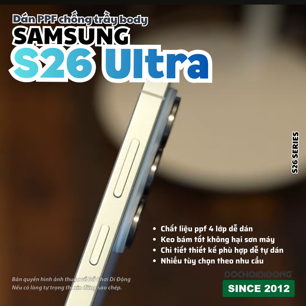 Làm nghề phụ kiện bao năm, tiếp xúc với vô số dòng máy cao cấp, mình thật sự thấy tiếc khi anh em cầm trên tay siêu phẩm Samsung Galaxy S26, S26 Plus (S26+) hay S26 Ultra tuyệt đẹp mà lại giấu nhẹm đi trong những chiếc ốp lưng dày cộm. Nếu anh em đam mê cảm giác vuốt chạm "máy trần" mát lạnh, phô diễn trọn vẹn thiết kế gốc mà vẫn sợ trầy xước, thì bộ dán PPF (Paint Protection Film) này sinh ra chính là "chân ái" dành cho anh em!